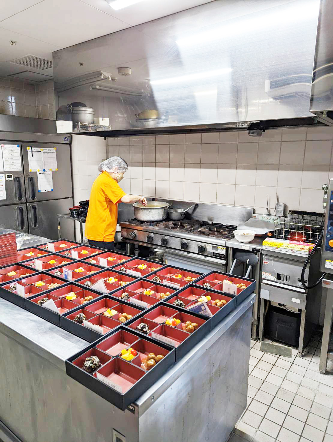 当施設では、日々の食事をお客様にご提供するため、日清さんからの委託で厨房で調理をした料理を提供しています。